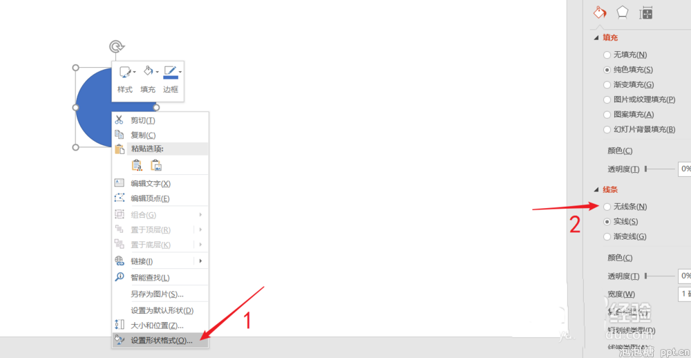1、首先,我们在PPT空白文档中插入一个圆,这个圆我们就是用来做眼睛的轮廓,将圆的外线条设置为无线条,如下图所示。