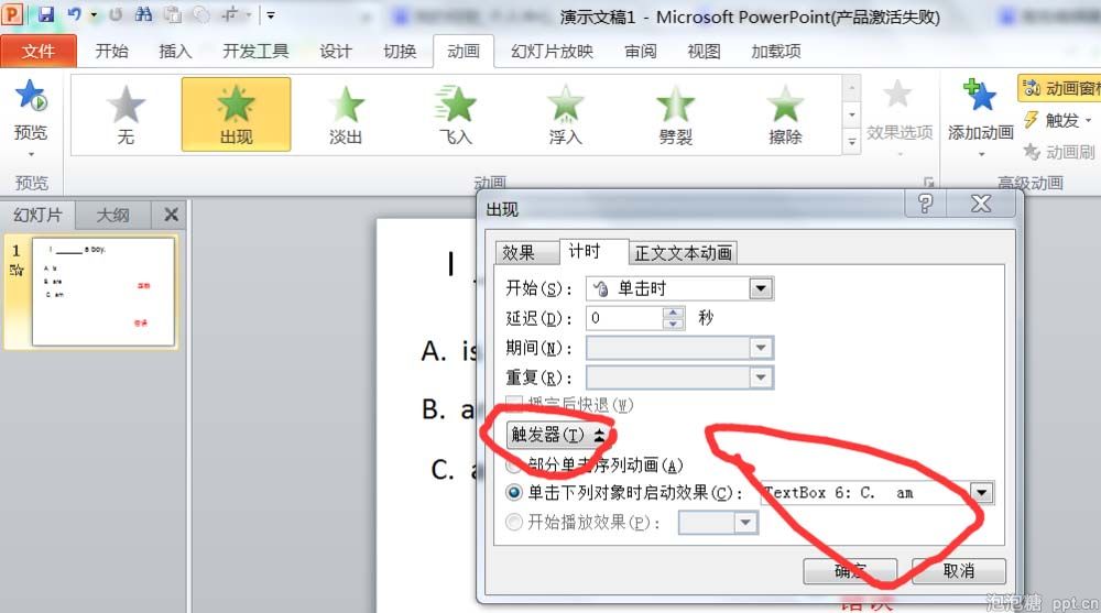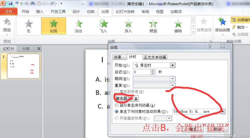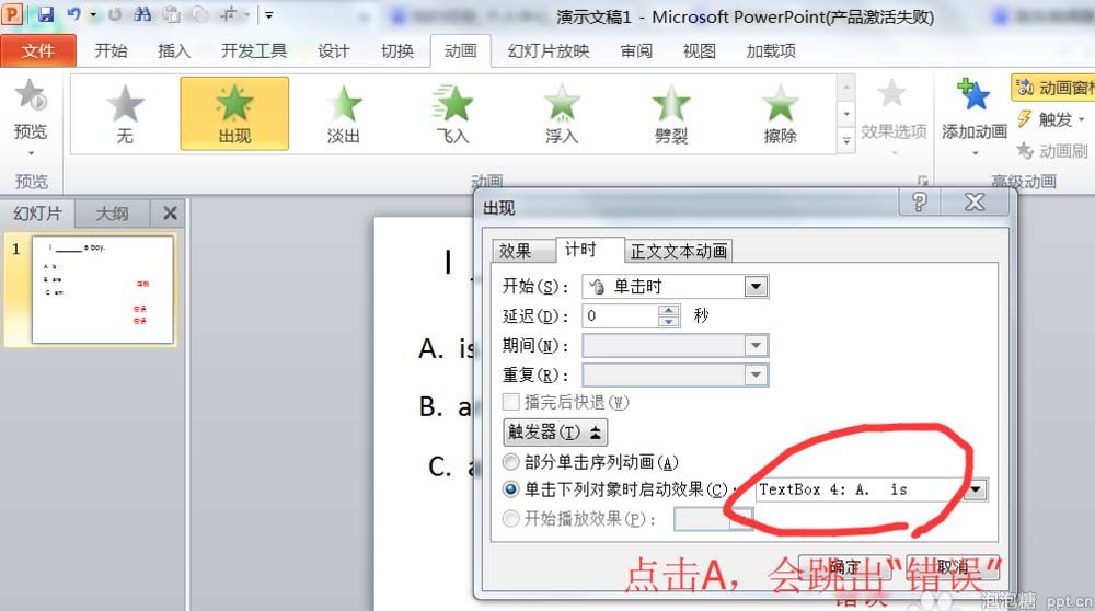 4、对“正确”的文本框设置动画的触发器,当点击C选项,就会触发动画效果。对“错误”的文本框设置动画的触发器,当点击A选项,就会触发动画效果。对“错误”的文本框设置动画的触发器,当点击B选项,就会触发动画效果。