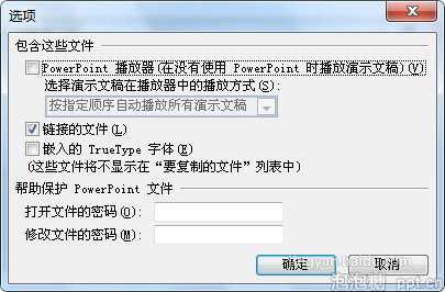 2、在选项种把Powerpoint播放器去掉,并勾选“链接的文件”,