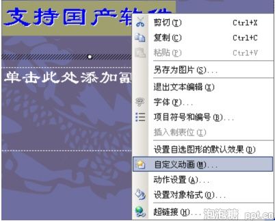 1.首先选中要闪烁的文字,右击鼠标,点击“自定义动画”如图: