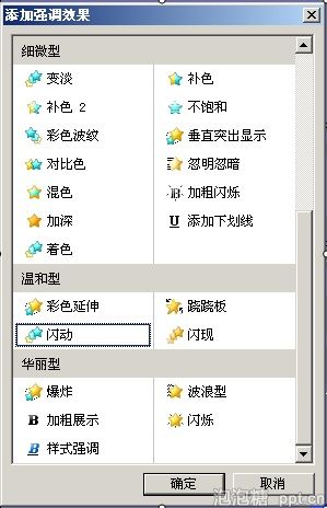 3.在“添加强调效果”菜单中,选中“闪动”然后点击“确定”,如图: