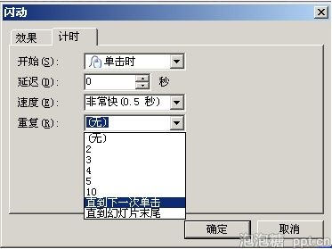 5.在“计时”栏里将“重复”项,改为“直到下一次点击”,如图: