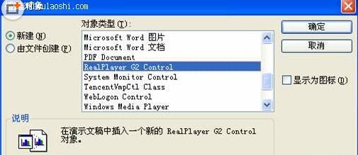 通过菜单“插入”“对象”,打开“插入对象”窗口(如下图),选择“RealPlayer G2 Control”,如果没有这一选项说明你的机器中没有安装RealPlayer播放器。确定后,会在屏幕上出现一个正方形区域。