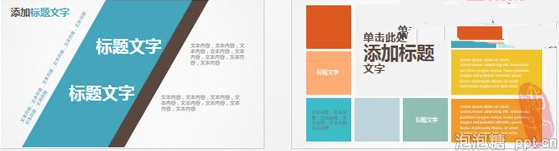 左边:不规则的色块与文字相结合很是提神,由于色块角度的倾斜打破了习惯性视觉,在提神的同时也会给浏览者造成一定的不适,建议在PPT页面排版中零星使用。