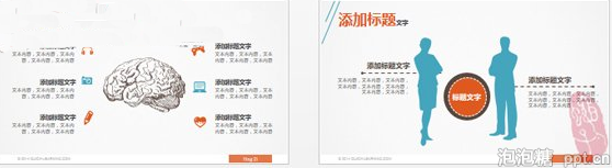 左边:ppt模板(www.pptjia.com)人物图标作为页面背景,降低透明度,和前面的图标相呼应,创造错落有致的层次感,配以文字。