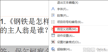 右击鼠标 。右击鼠标之后,你会发现出现一列菜单栏,然后选中自定义动画一栏,如下图所示:
