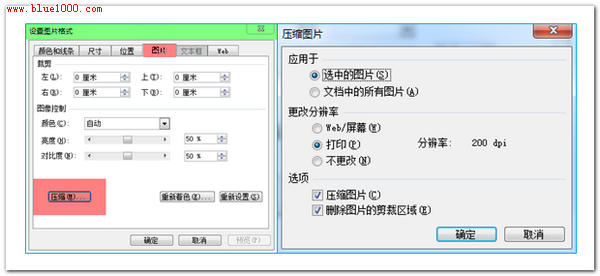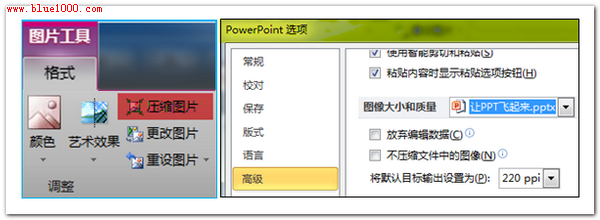 PowerPoint 2007/2010操作类似,单击图片会出现图片工具/格式选项卡→调整组→压缩图片。与PowerPoint不同的是,PowerPoint 2007/2010专门提供了对于图片压缩的设置,单击文件选项卡进入PowerPoint选项,选择高级选项——图像大小和质量,在这里可以对PPT图像的压缩保存进行相关设置。