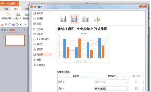 3、进入“图表”,看到这么多的图表类型,亲们是不是眼晕了呢,没关系,咱主题是做个含有柱状图与折线图的图表,那么理所当然的应该选“组合图”啦,这里还有一点需要大家注意的地方,因为数据的不同对比,无法在一个坐标轴上体现,也为了能更加清晰直观的展示数据变化,所以我们选择“次坐标轴上的折线图”;