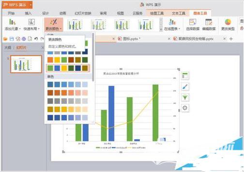 7、图表已经设计完毕,但不要忘了填写图表标题哦,另外可以根据个人需要调整图表数据的颜色,在“更改颜色”处,可以选择相应颜色进行调整,下图第一个为调整颜色前,第二个为调整后;