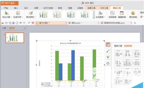 8、如果该图表的布局不能达到个人要求的话,可以点击图表,选择第一个控件,在“快速布局”处调试挑选出适合自己的图表布局格式,一个图表能否很快的别别人看懂,跟布局格式也是很有关系的。