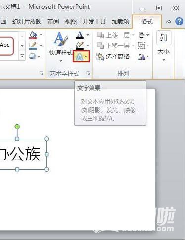 首先在文本框中输入好文字,选中文本框,单击菜单栏格式--文字效果按钮。