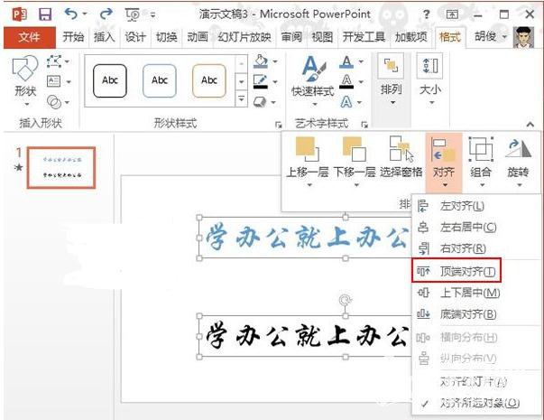 6 Ctrl+A键选中2个文本框,点击菜单栏--格式--排列,选择顶端对齐。