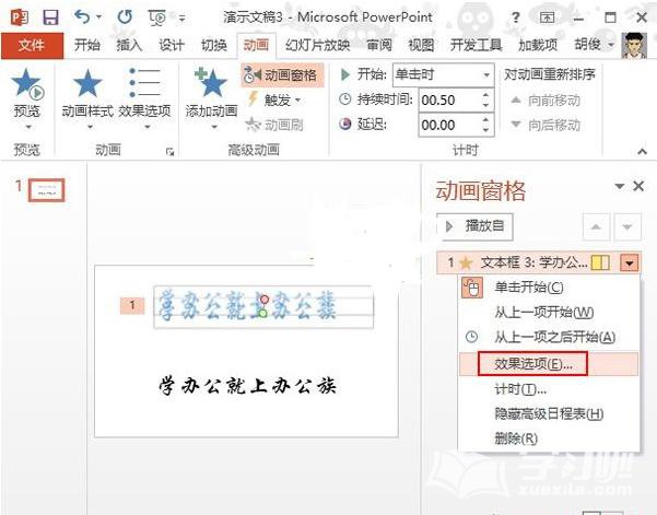 4 单击右侧动画窗格中的小三角箭头,选择效果计时。