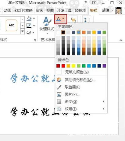 2 选中上排那个文本框,单击文本颜色按钮,改变颜色,让其与下面的不一样。