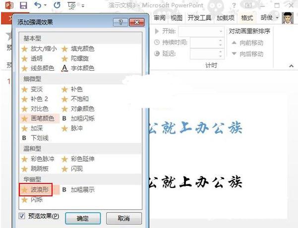 3 给上面那个文本框添加动画效果,点击添加效果按钮,在强调效果中选择波浪形。
