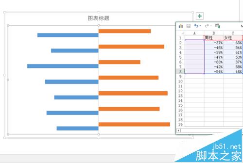 2、编辑数据。调出数据编辑表格,我们只需要留两列,注意,这里要写百分数,且男性那一列数字为负值。
