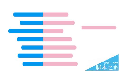先插入一个“同侧圆角矩形”,设置形状颜色为蓝色,边框为透明,按住shift向左旋转90°。Ctrl+C这个矩形,再选中男性那一栏的图表,Ctrl+V,即得到下图效果(教程参考下文)。女性那一栏同样的方法,更改颜色,旋转180°后再复制粘贴。