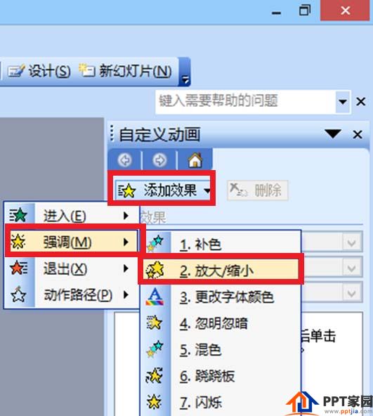 2、选中文本框,点击右侧自定义动画栏中的“添加效果”,在弹出框中选择“强调——放大/缩小”。