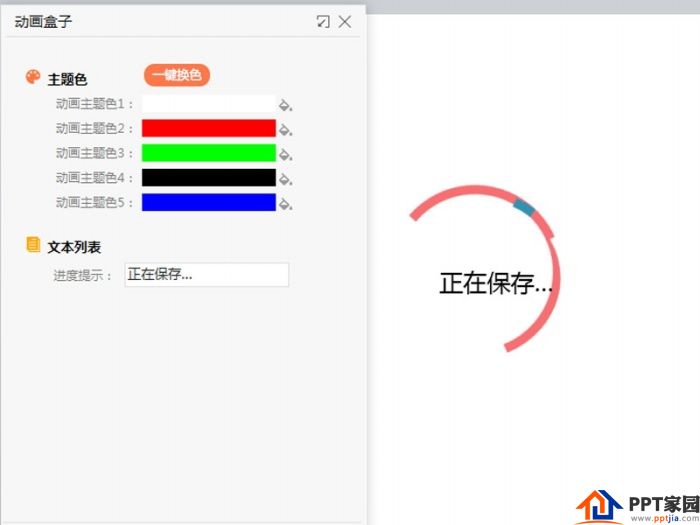 3、在动画盒子对话框中,修改自己喜欢的动画主题颜色,并修改文本列表中的进度提示内容为正在保存。