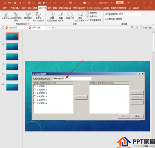 接着,在幻灯片放映名称中输入易于识别的一个名字,比如只播放奇数页或只播放偶数页。