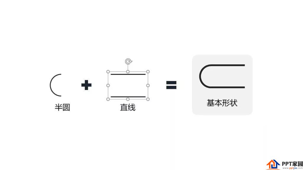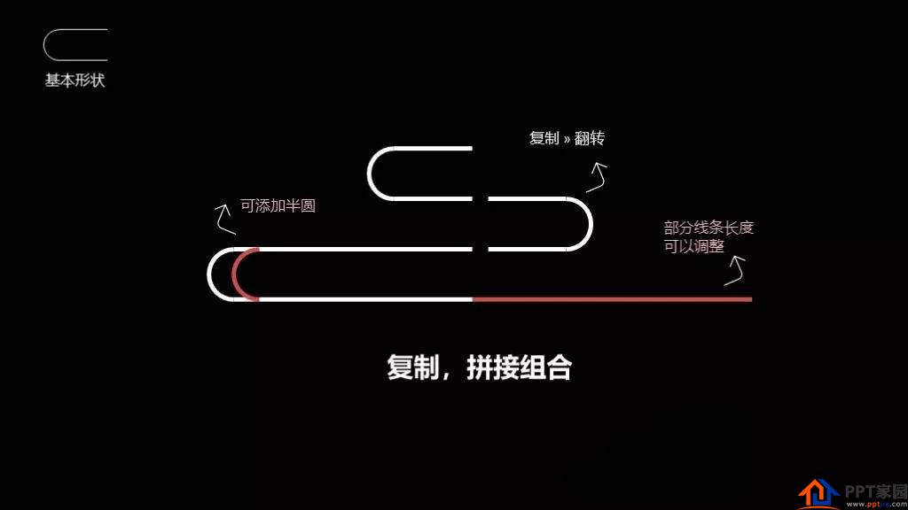 4、插入形状 » 任意多边形,按住 Shift 键画 2 根直线,与半圆进行组合完成基础形状。核心元素完成!