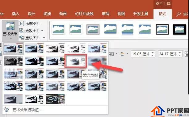 选中图片 » 图片工具(格式)» 艺术效果 » 发光散射
