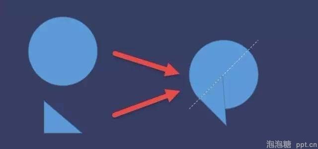 6、制作逗号,插入一个圆形,一个直角三角形,然后将其按下图组合在一起。下图中虚线为45度的直径参考。