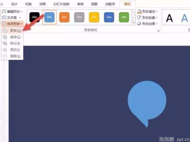 7、选中圆形和三角形,点击“合并形状 -> 联合”按钮,将其组合成一个图形。