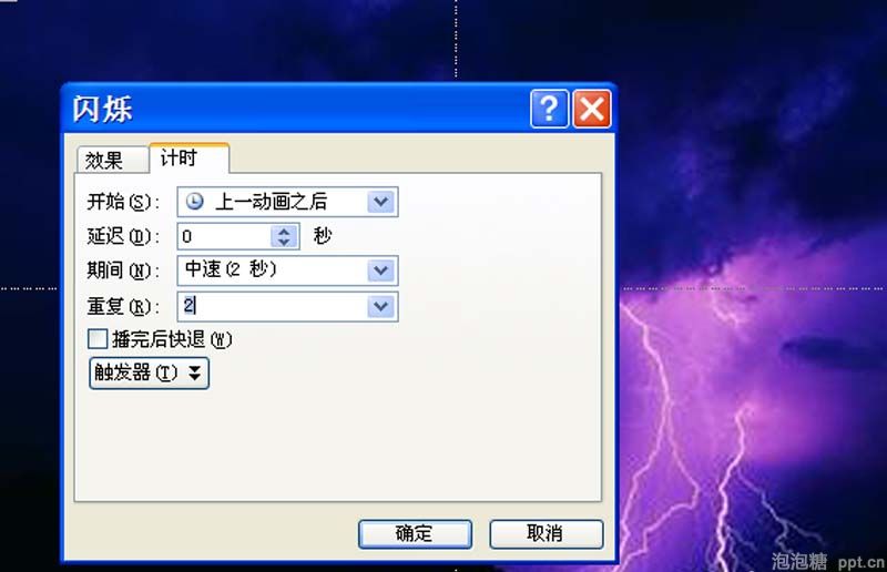 7、选择和上面图片相同的图片,同样设置相同的动画效果,右键单击该动画选择计时选项,在弹出的对话框中设置开始为上一个动画之后,期间设置中速2秒,重复设置为2,点击确定按钮。