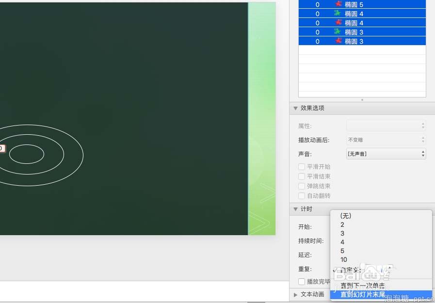 6、选中所有的动画,在效果选项的重复栏里选择直到幻灯片末尾,播放检查一下就可以了