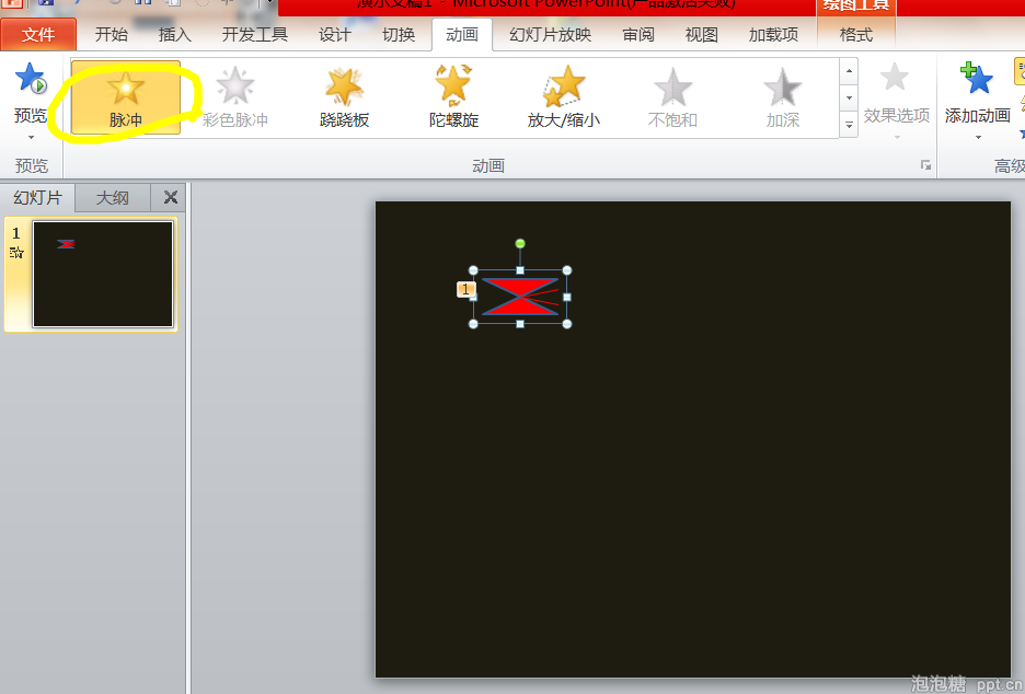 第四,对蝴蝶设置动画,效果为“脉冲”和路径为“直线向右”,两种动画同时启动。