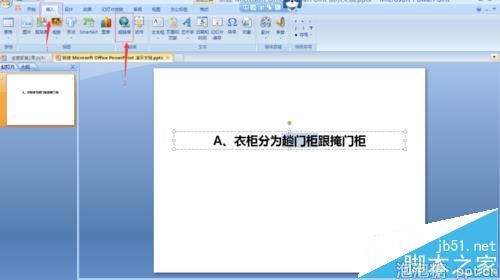 1、首先,打开PPT,找到需要链接的文字,然后选中该文字,比如图中的“趟门柜”