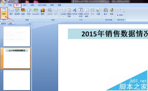 1、首先在需要插入Excel电子表格的幻灯片中,把属性栏切换到插入选项,选择表格组中的表格按钮。