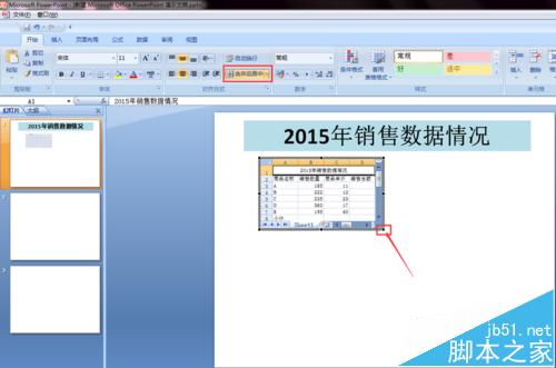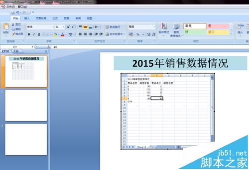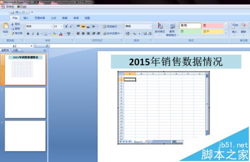 3、随即会在幻灯片中显示Excel电子表格,同时看到的幻灯片界面已被Excel表格形式半覆盖。