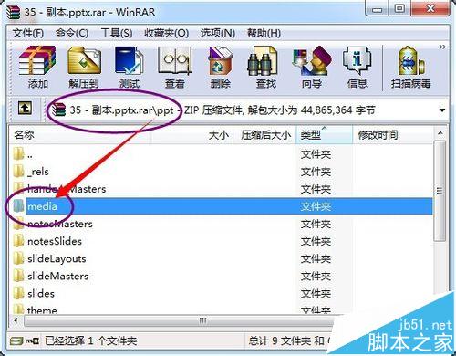 3、双击进入【PPT】目录中,就能看到一个【media】目录。