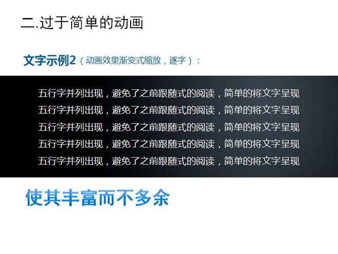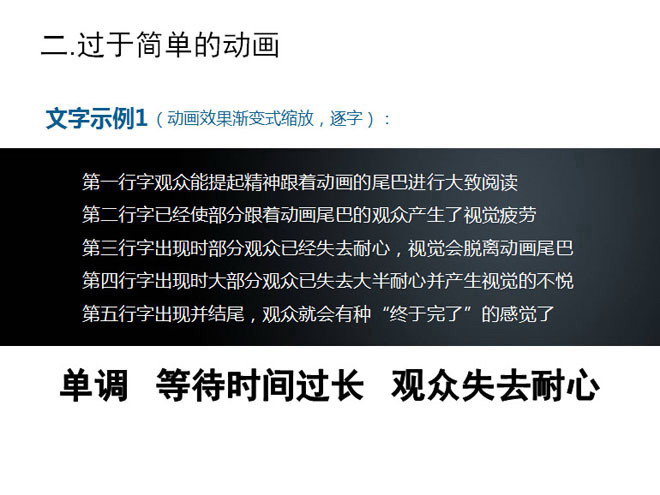 即便是再华丽的动画效果,看久了也是会让人产生排斥感,也就是我们常说的审美疲劳,尤其是1部信息量较大的PPT,人们在了解PPT本身信息的同时,还要去关注整个动画复杂繁琐的演示流程,这无疑给视觉上带来了很大不悦,缺乏干练简洁的动画效果,表现方式拖泥带水,这样的动画就不是成功的。