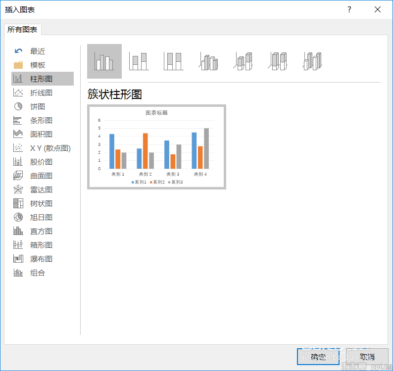 2、在“菜单栏”中找到“插入”,在插入的图表区域选择“图表”,即可在弹出的对话框中选择我们想要的数据类型,这次我们选择的是默认(柱状图)