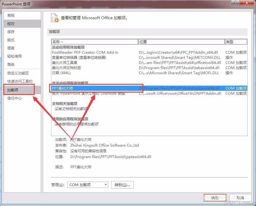 4、在最下方的“管理”中选择COM加载项,并点击右侧的“转到”。在弹出的“可用加载项”对话框中勾选PPT美化大师并点击确定。