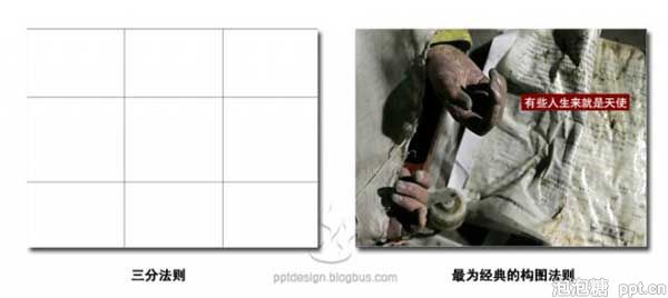 中国人叫九宫格,是最被大家熟知的PPT构图原则,在摄影,网页设计上也被大量采用,PPT版式中如果图片放在上三分一,就有了“天”,放在下三分一,就有了“地”,关于天地我一直很另外想写一篇PPT教程文章,以后吧。