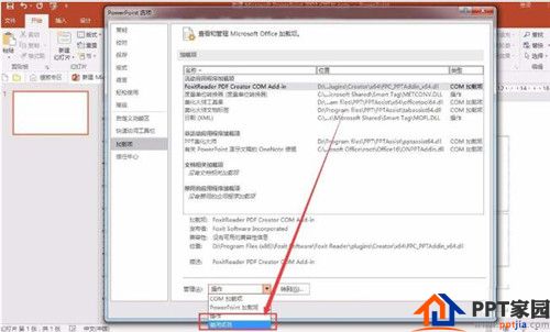 4、在最下方的“管理”中选择COM加载项,并点击右侧的“转到”。在弹出的“可用加载项”对话框中勾选PPT美化大师并点击确定。