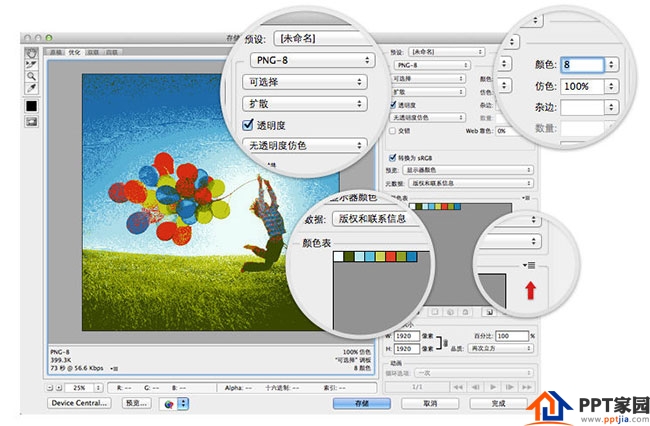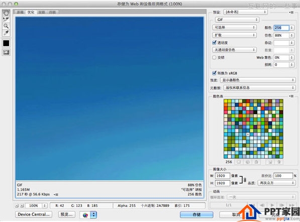 把选中的图片放入PS中,点击“存储为web所用格式”(如果没有色彩非常合适的图,可以再ps里适当的调整颜色再进行颜色提取),格式选为png-8,色块选择8,(数字越大色块越多,视自己需求而定)。