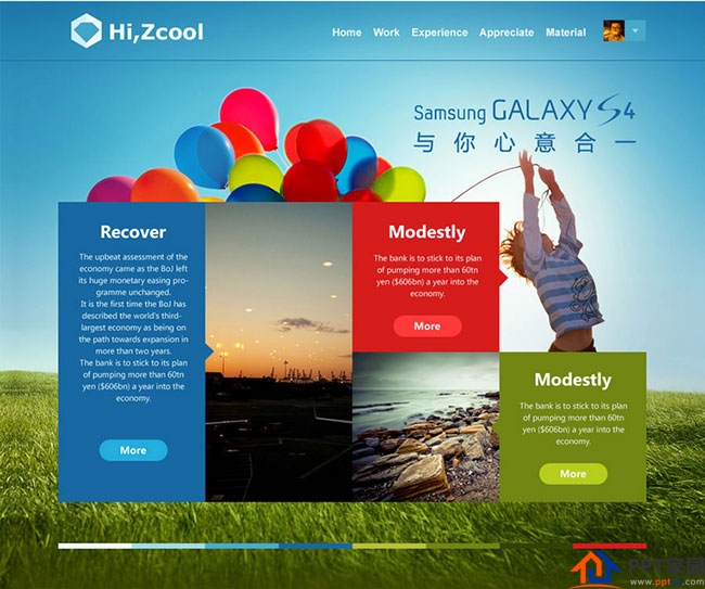 3、 内容区域出现的提取到的三哥色相的色彩,如果只是排列剩下的几个颜色的话,颜色会很冲,我完全不能接受!所以找了几张图片用来过渡颜色,调整画面的节奏,现在看来效果还不错。内容区域的文字颜色与导航文字一致,都是很浅的蓝色。